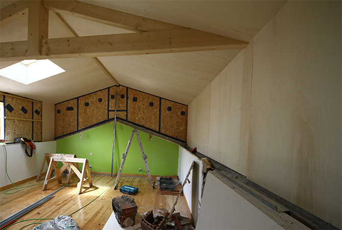 -Le parement intérieur est composé de panneaux contreplaqués en peuplier (bois très clair avec un veinage discret) sur les parties rampantes et les 2 murs bas de pente sur la hauteur de la surélévation.